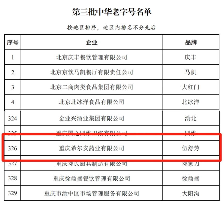 這一天,國(guó)家商務(wù)部、文化和旅游部、市場(chǎng)監(jiān)管總局、國(guó)家知識(shí)產(chǎn)權(quán)局、國(guó)家文物局5部門聯(lián)合公布了第三批中華老字號(hào)名單,重慶伍舒芳健康產(chǎn)業(yè)(集團(tuán))有限公司(重慶希爾安藥業(yè)有限公司)旗下的“伍舒芳”品牌成功上榜,榮獲了第三批中華老字號(hào)認(rèn)定!